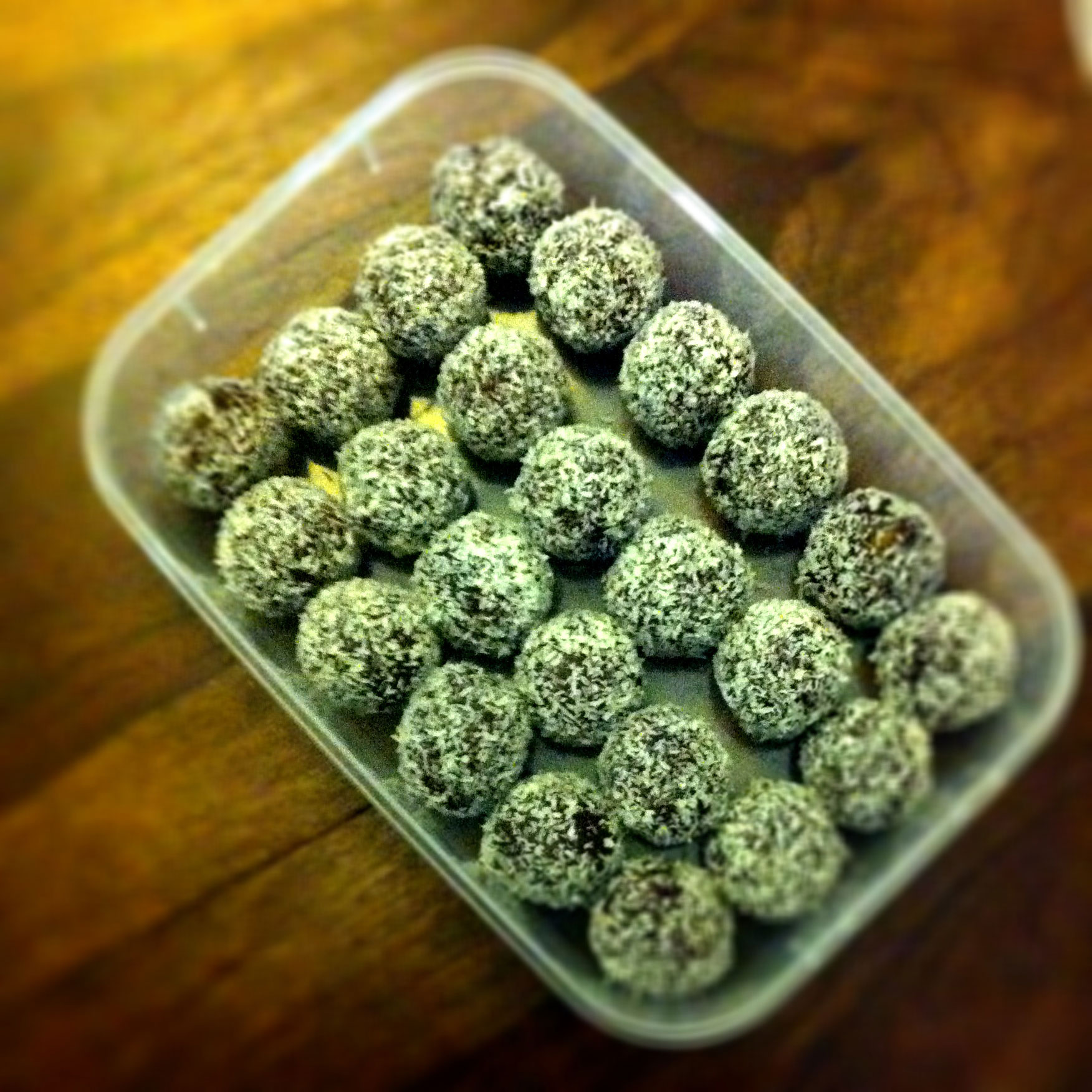 - Dampen your hands lightly in the water, pinch off a heaped teaspoon of the mixture and roll into a ball between your palms. Drop the ball into the coconut. Once you have 3 or 4 balls, roll them around in the coconut to coat evenly, then pop in your container. Dampen your hands in the first bowl (to remove any coconut stuck to your fingers and prevent the balls from sticking to your hands) and repeat the process until you’ve rolled all the mixture. If you find any fibrous pieces of date in the mixture, discard them to ensure a smooth texture.