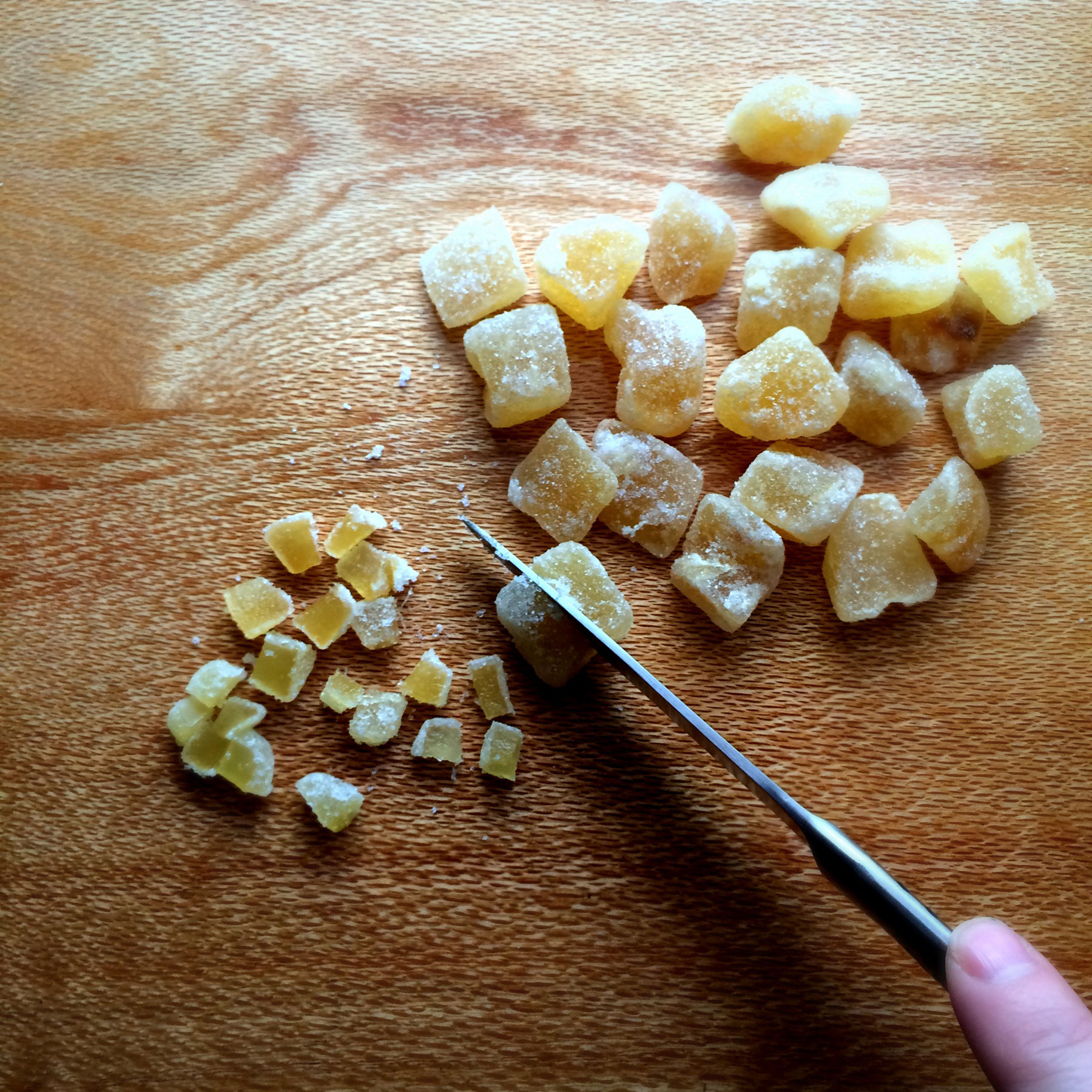 - Sort through your crystallised ginger, removing 20g (around 8 or 10 pieces) with one square profile. Slice these thinly into slices that look like small squares (don’t expect perfection..square-ish will do) and set aside for decorating the cookies just before baking.