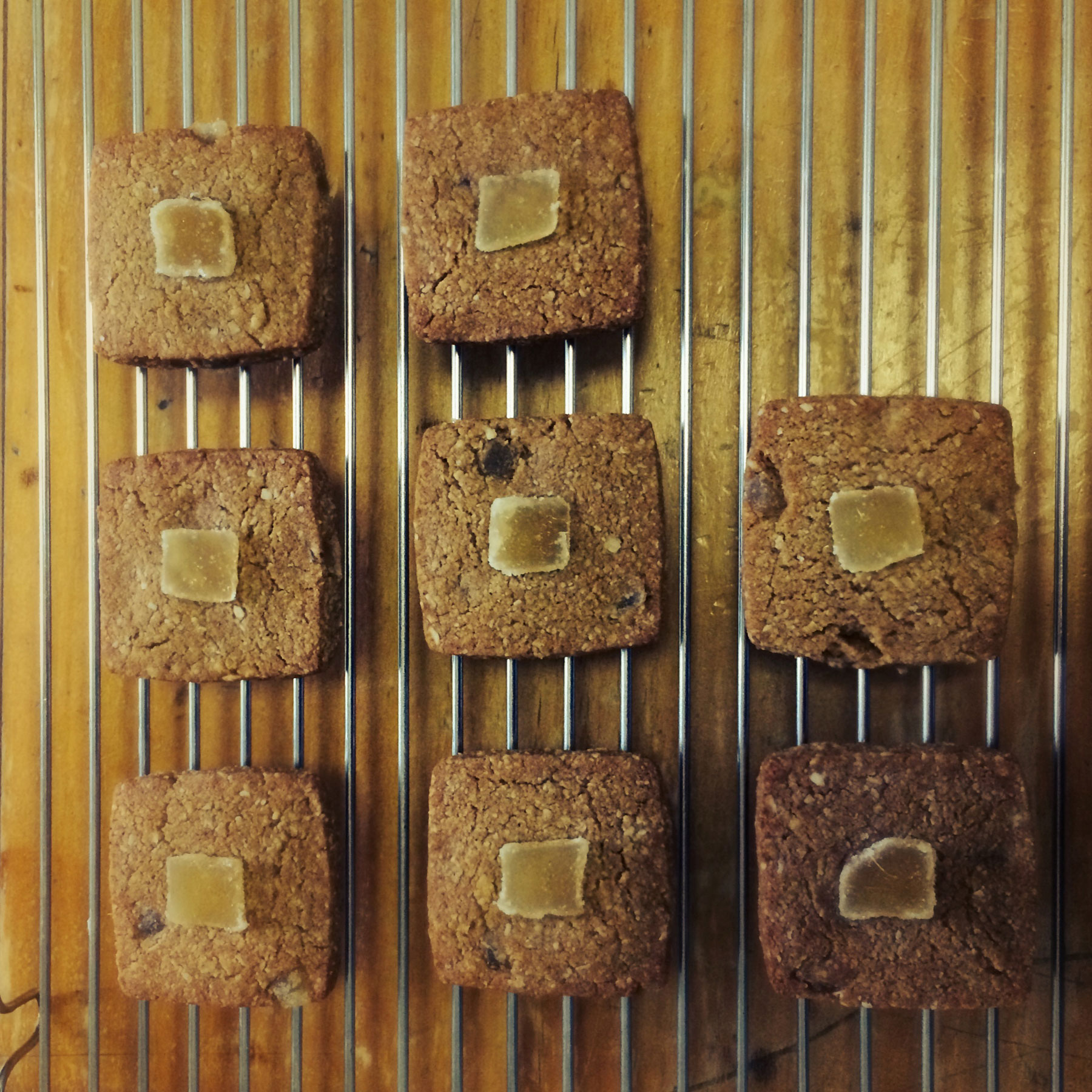 - Press a square slice of crystallised ginger gently into the centre of each cookie.