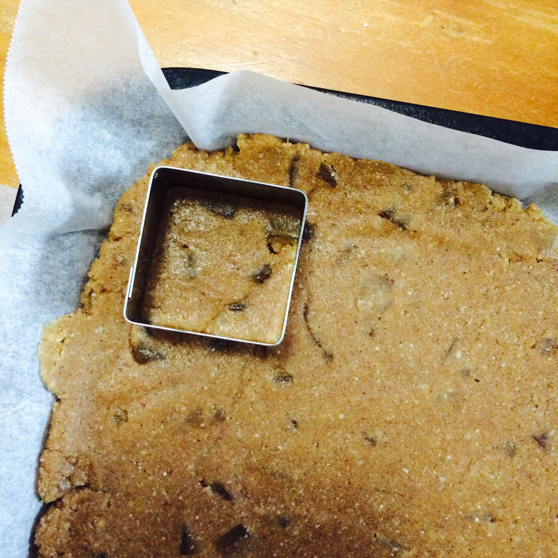 - Using a 4.5-centimetre square cookie cutter, stamp out the first 30 cookies (15 per oven tray) by pressing the cutter into the dough and giving it a little tiny twist back and forth—you may need to use a little force to cut through the ginger chunks.You will need to occasionally clean the cookie cutter as you go to ensure a neat result. Once you’ve stamped 15 cookies, peel off the excess dough surrounding your cookies.